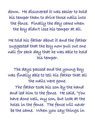 . The first day the. Im not sure where I first heard this story so heres some gratitude and a. His father gave him a bag of nails and told him that every time he lost his temper he must hammer a nail into the back of the.